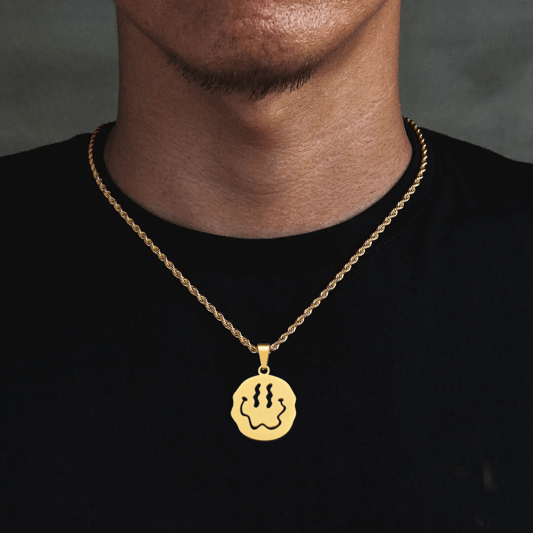 תליון בעיצוב סמיילי, עשוי ציפוי זהב 18K. התליון מגיע עם שרשרת חבל באורך 55 ס"מ. קוטר התליון הינו 3 ס"מ.